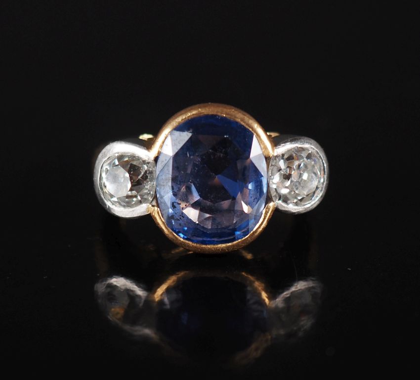 Bague en or jaune 750 et platine, sertie en son centre d'un saphir épaulé de deux diamants pesant environ 0,4 ct chacun. TDD. 49 Poids tel. 8,36 g