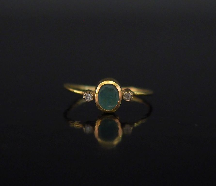 Bague en or jaune 750, sertie en son centre d'une émeraude épaulée de deux éclats de diamant. TDD. 52 1/2 Poids tel. 1,14 g (petites usures à l'émeraude)