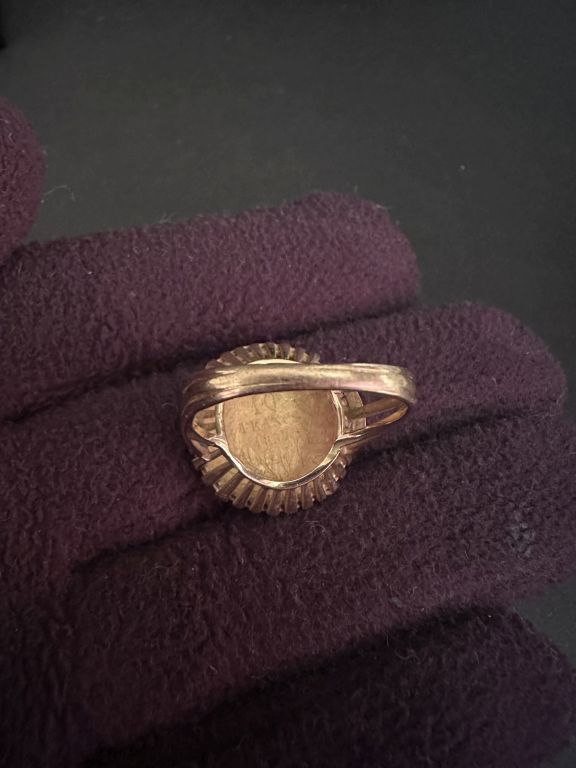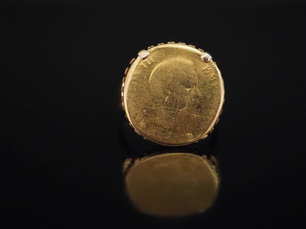 Bague en or jaune 750, sertie en son centre d'une pièce de 10 Francs or, 1857. Jolie monture ajourée. TDD. 55 Poids. 7,60 g (pièce effacée en partie)