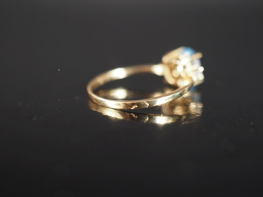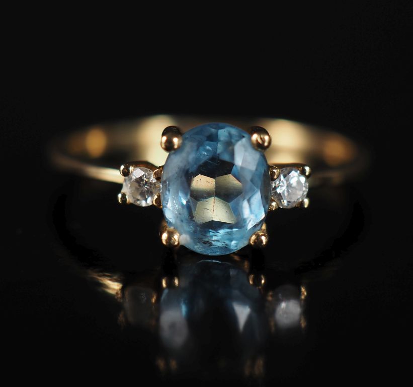 Bague en or jaune 750, sertie en son centre d'une pierre bleu ciel épaulée de deux petits diamants. TDD. 52 1/2 Poids tel. 1,86 g