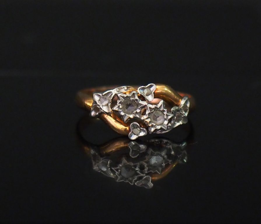 Bague en or jaune, à décor de motif feuillagé, sertie d'éclats de diamant. TDD. 57 Poids tel. 2,89 g (soudure ancienne à l'anneau)