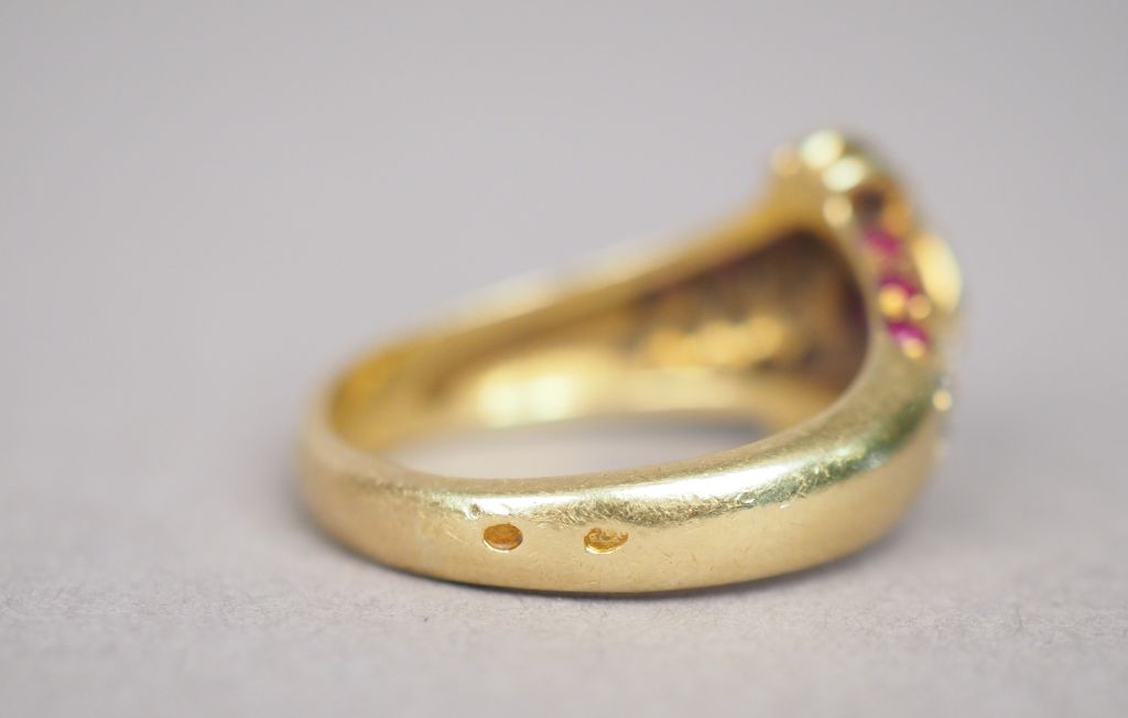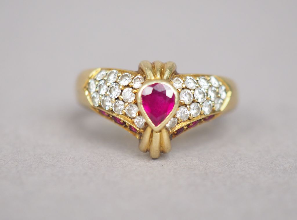 Bague en or jaune, à décor d'un noeud stylisé, ornée en son centre d'un rubis entouré de petits diamants. TDD. 58 Poids tel. 7,62 g