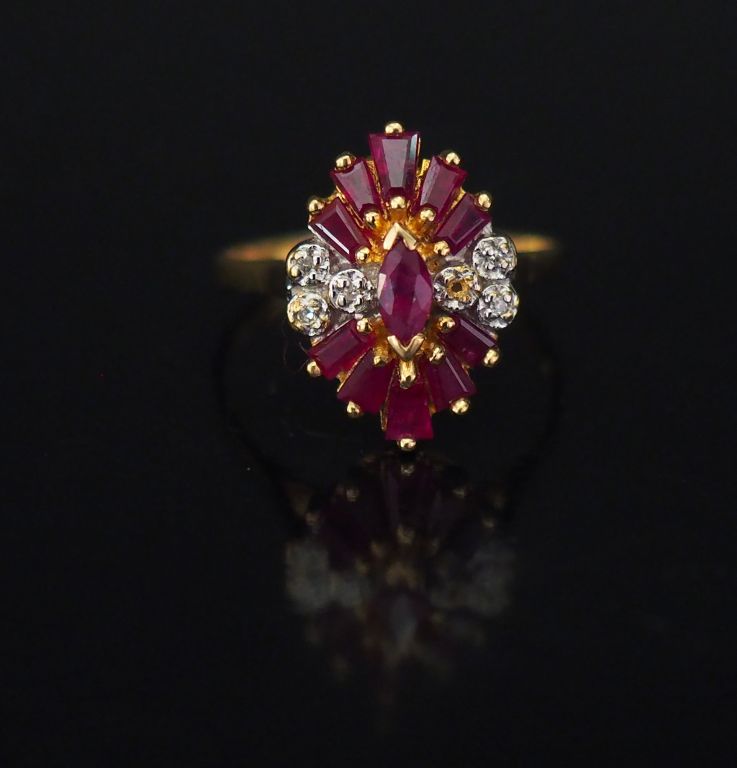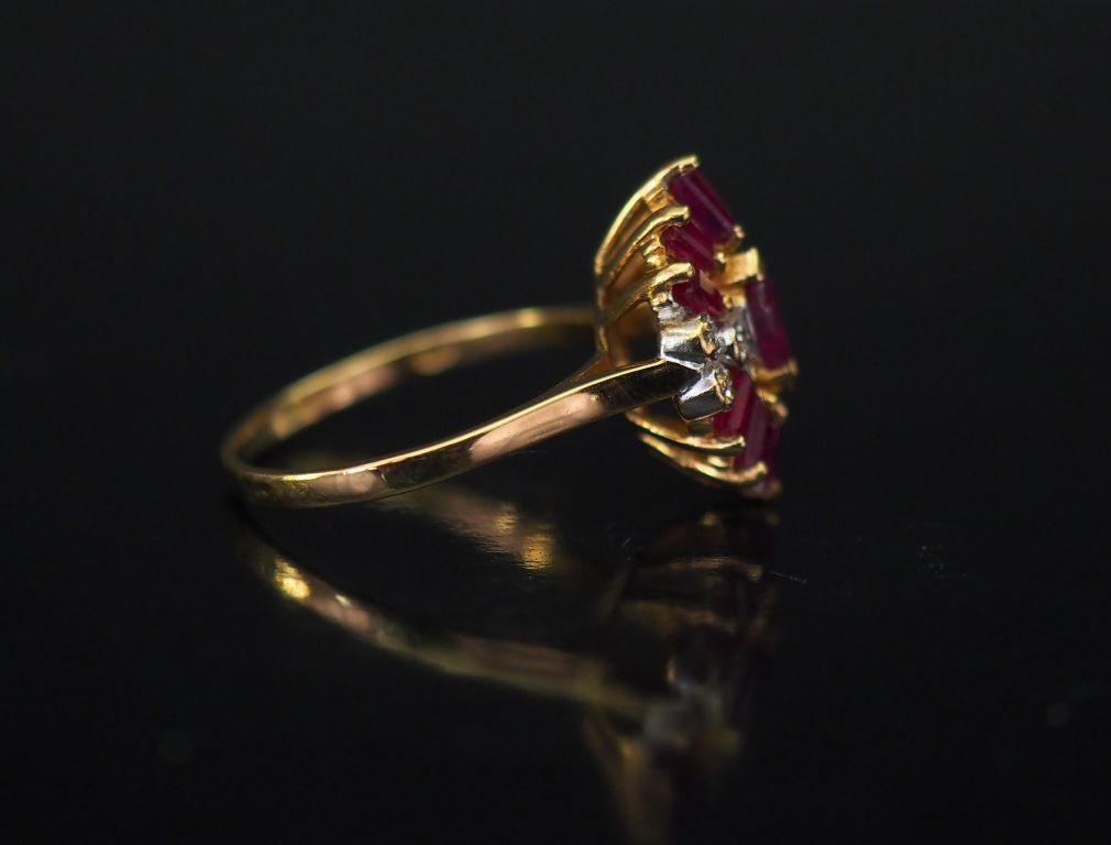 Bague en or jaune de forme stylisée, sertie de rubis calibrés et petits éclats de diamant. TDD. 53 Poids tel. 3,42 g (manque un éclat)