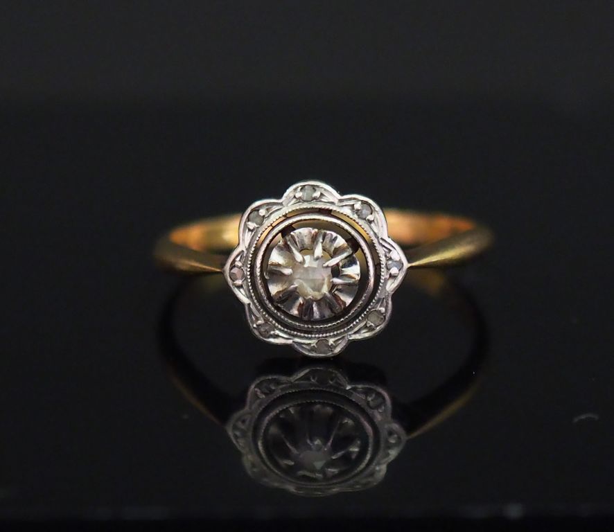 Bague en or jaune en forme de fleur, sertie en son centre d’une petit diamant taillé en rose entouré de petits éclats de diamants. TDD. 56 Poids tel. 2,14 g