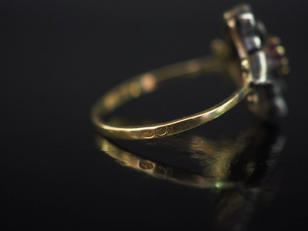 Bague en or jaune et argent, à décor ajouré de rinceaux et sertie en son centre d'une pierre rose épaulée de deux éclats de diamant. TDD. 60 Poids tel. 3,12 g