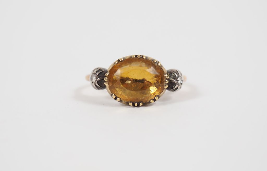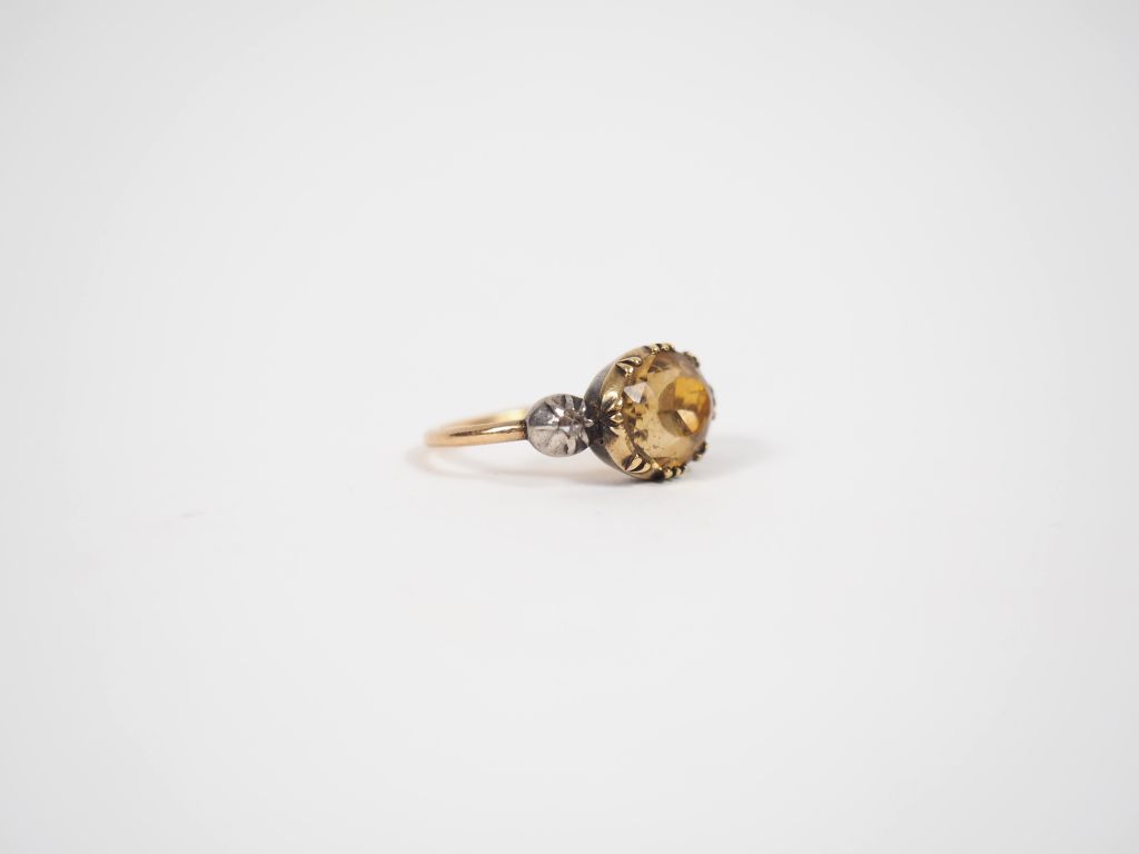 Bague en or jaune et argent, ornée en son centre d'une pierre jaune épaulé de deux petites roses. TDD. 55 Poids tel. 4,11 g