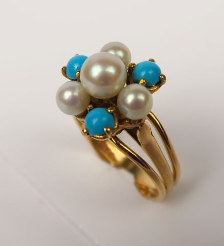Bague en or jaune figurant une fleur, sertie de turquoises et petites perles. Poids : 6.5 g