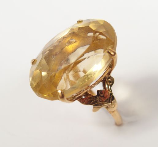 Bague en or jaune, monture travaillée décor de feuille d'acanthe, ornée d'une topaze jaune taille ovale de 22ct environ. TDD 52 Poids tel: 6,2gr