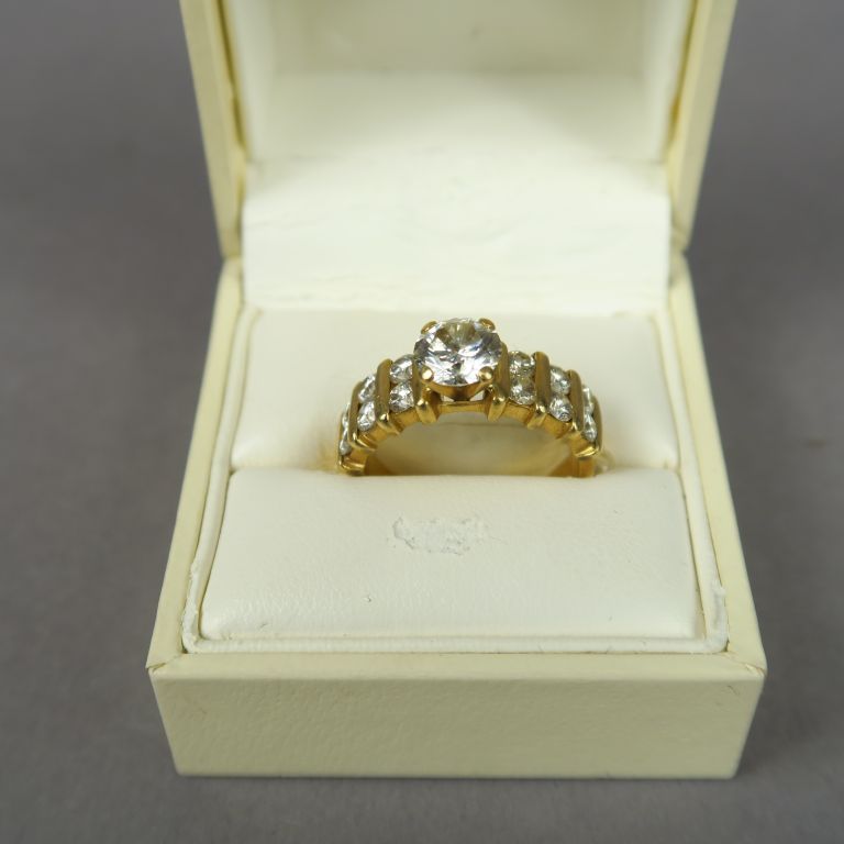 Bague en or jaune, ornée d'un diamant central d'environ 1,18 cts épaulé de deux lignes de trois petits diamants. TDD. 54 Poids t el. 7,22 g