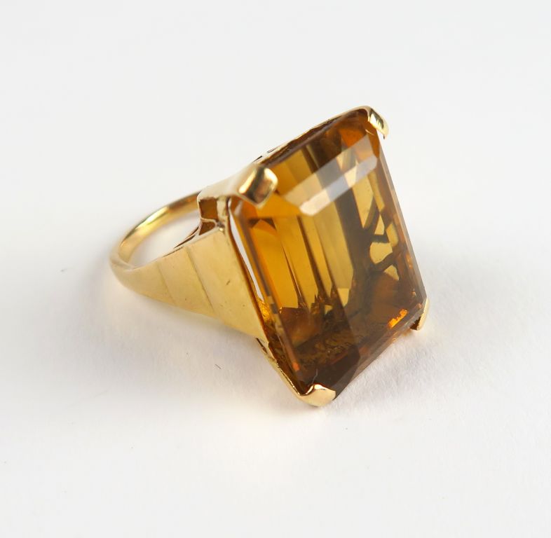 Bague en or jaune, ornée d'un quartz taille émeraude. Poids tel : 10,8 g