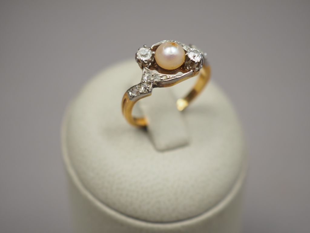 Bague en or jaune, ornée d'une perle entourée de diamant et de roses. TDD. 52 Poids tel. 3,79 g (un diamant remplacé par un zirconium)