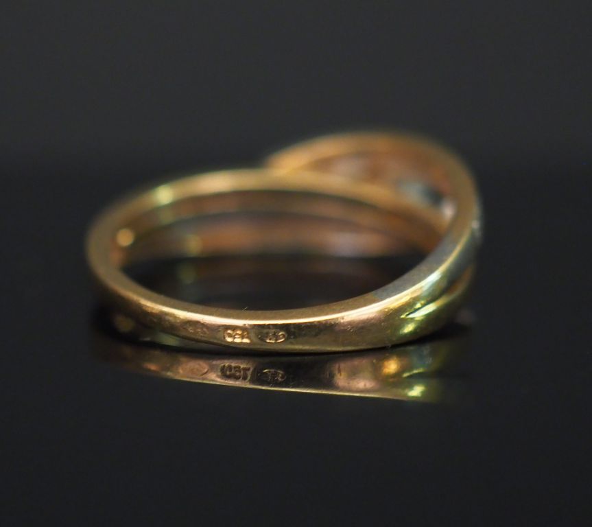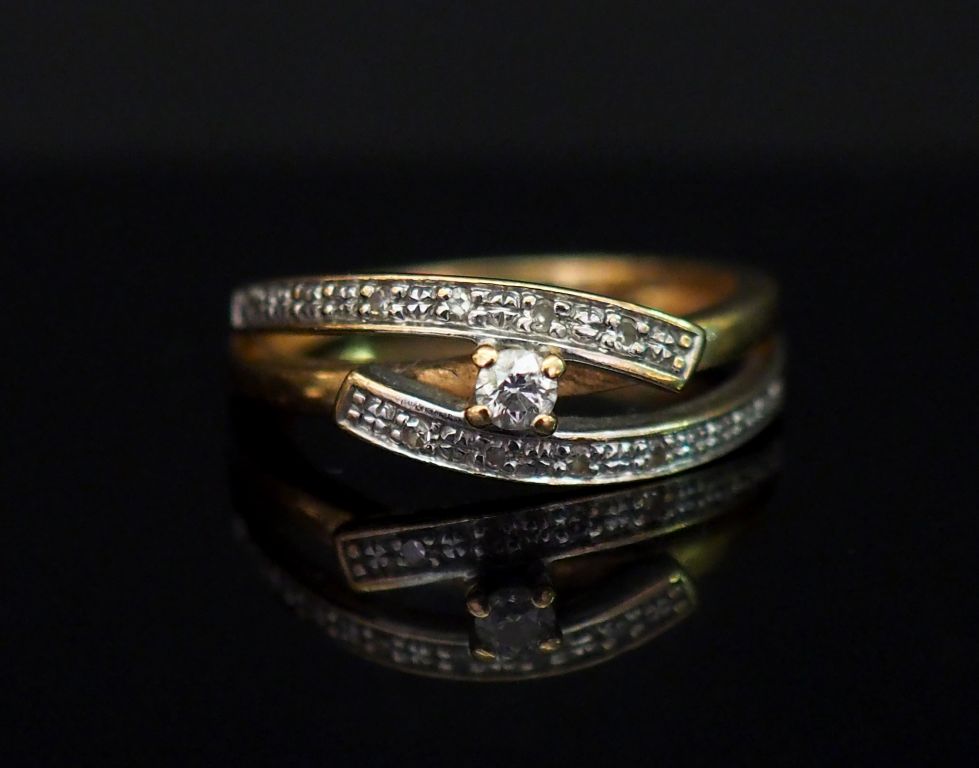 Bague en or jaune, sertie d’un diamant central et de petits diamants. Monture ajourée et incurvée. TDD. 53 Poids tel. 3,12 g