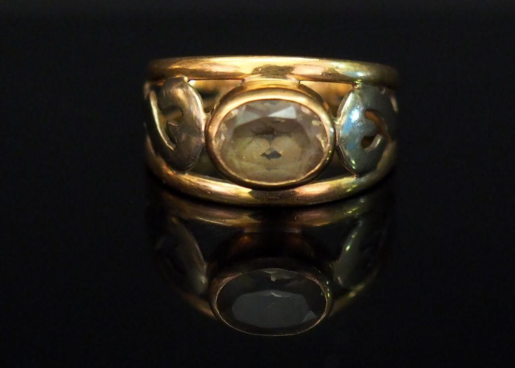 Bague en or jaune, sertie d’un quartz. Jolie monture ajourée, à décor de rinceaux. TDD. 54 Poids tel. 3,79 g