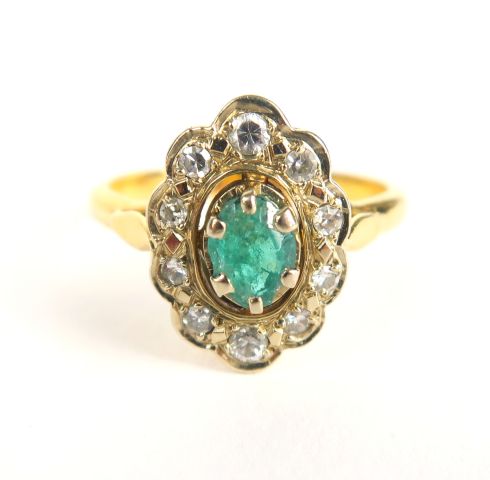 Bague en or jaune, sertie d'une émeraude dans un entourage de petits diamants. Poids tel : 3 g
