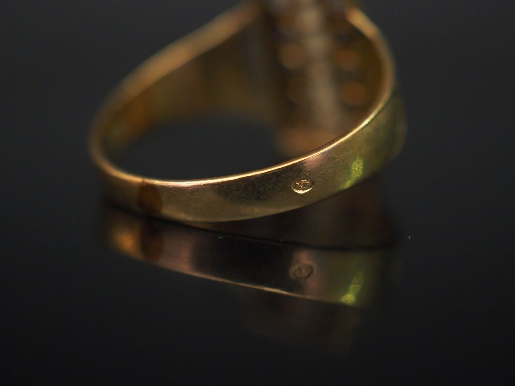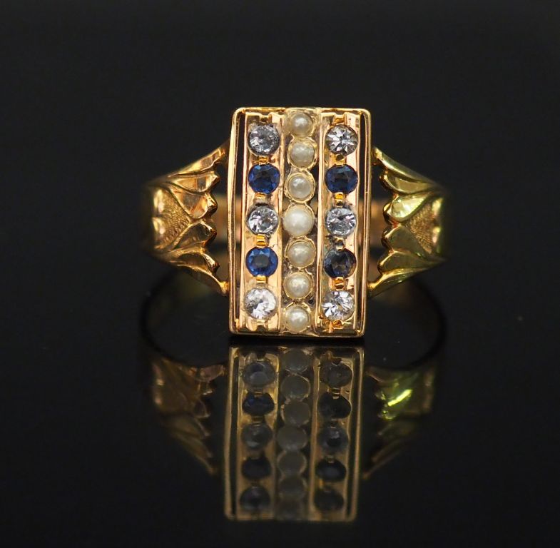 Bague en or jaune, sertie d'une ligne de perles blanches épaulée de deux lignes de petites pierres bleues et pierres à l'imitation du diamant alternées. Jolie monture ajourée. TDD. 61 Poids tel. 3,44 g (soudurance ancienne à l'anneau, légère usure)