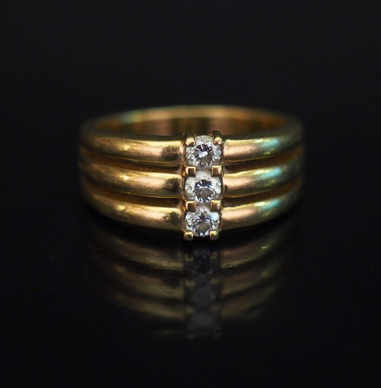 Bague en or jaune, sertie d'une ligne de trois petits diamants de 0,09 ct environ. Monture trois anneaux ajourée. TDD. 56 Poids tel. 8,95 g