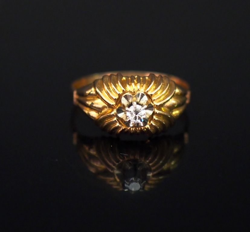 Bague en or jaune, sertie en son centre d'un petit diamant taille ancienne de 0,06 ct environ. Jolie monture godronnée et cannelée. TDD. 58 Poids tel. 1,63 g