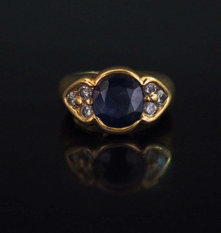 Bague en or jaune, sertie en son centre d'un saphir épaulé de six petits diamants. TDD. 51 Poids tel. 12,75 g