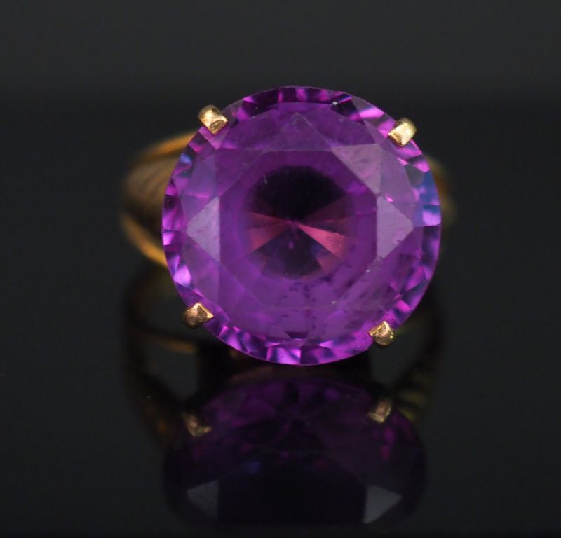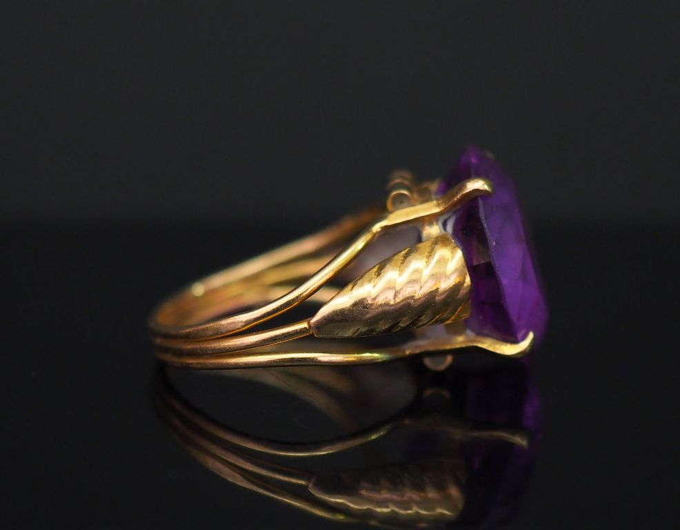 Bague en or jaune, sertie en son centre d’une améthyste. Jolie monture ajourée. TDD. 52 Poids tel. 6,35 g