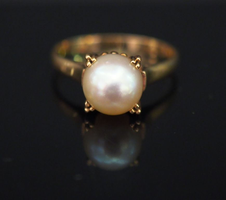 Bague en or jaune, sertie en son centre d’une perle blanche. TDD. 53 Poids tel. 2,88 g