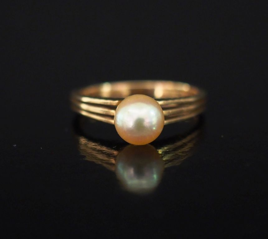 Bague en or jaune, sertie en son centre d'une perle. Jolie monture ajouré et ornée sur les deux côtés de motifs rayonnants. TDD. 54 Poids tel. 3,21 g