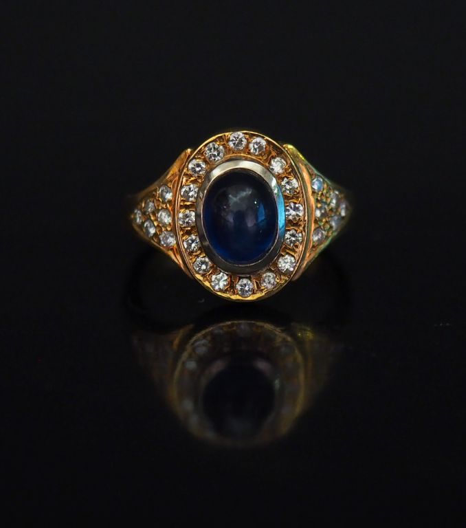 Bague en or jaune, sertie en son centre d'une pierre bleue en cabochon entourée d'une couronne de petits diamants. Le motif central agrémenté de part et d'autre d'un pavage de diamants disposés en triangle. TDD. 57 Poids tel. 7,87 g