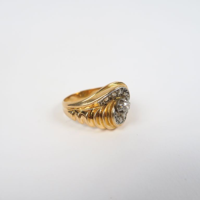 Bague en or jaune torsadée, diamant central entouré de roses. Poids : 10 g (manques)