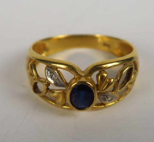 Bague en or sertie d'un saphir, monture ajourée à motif de feuillage. Poids tel : 3,21 g