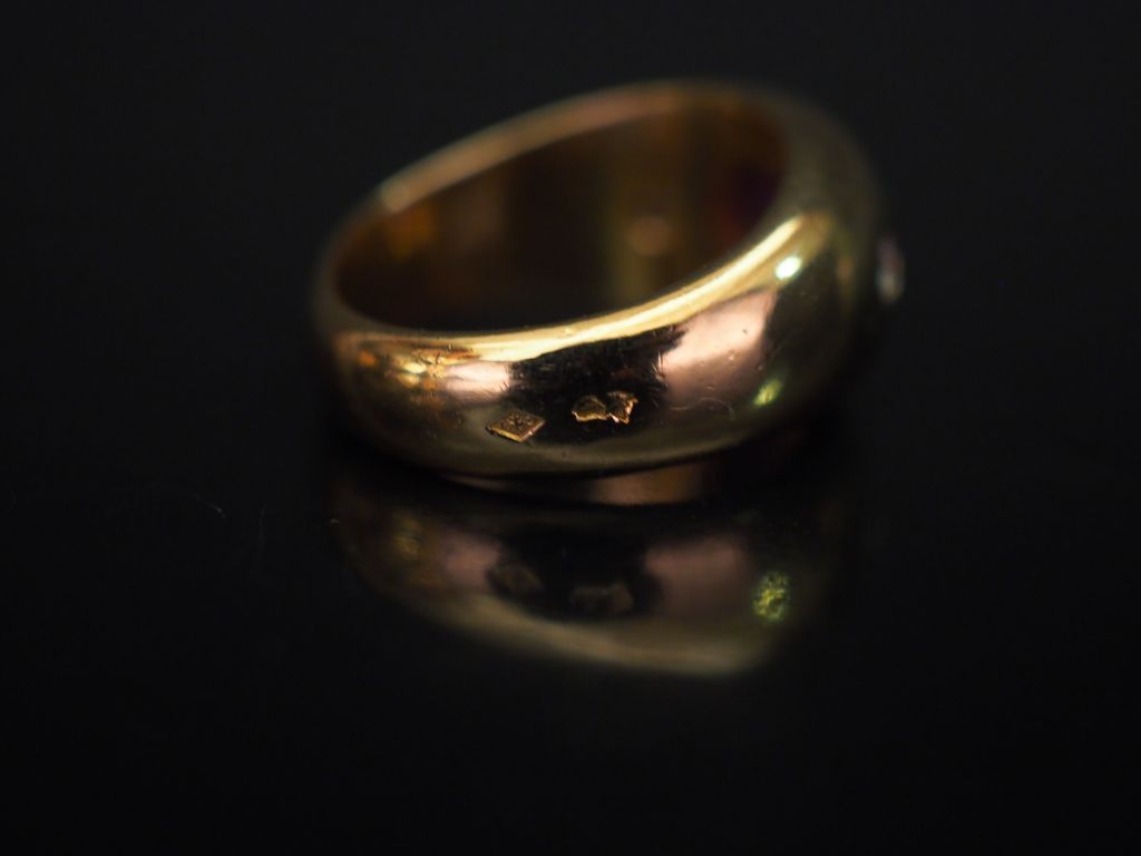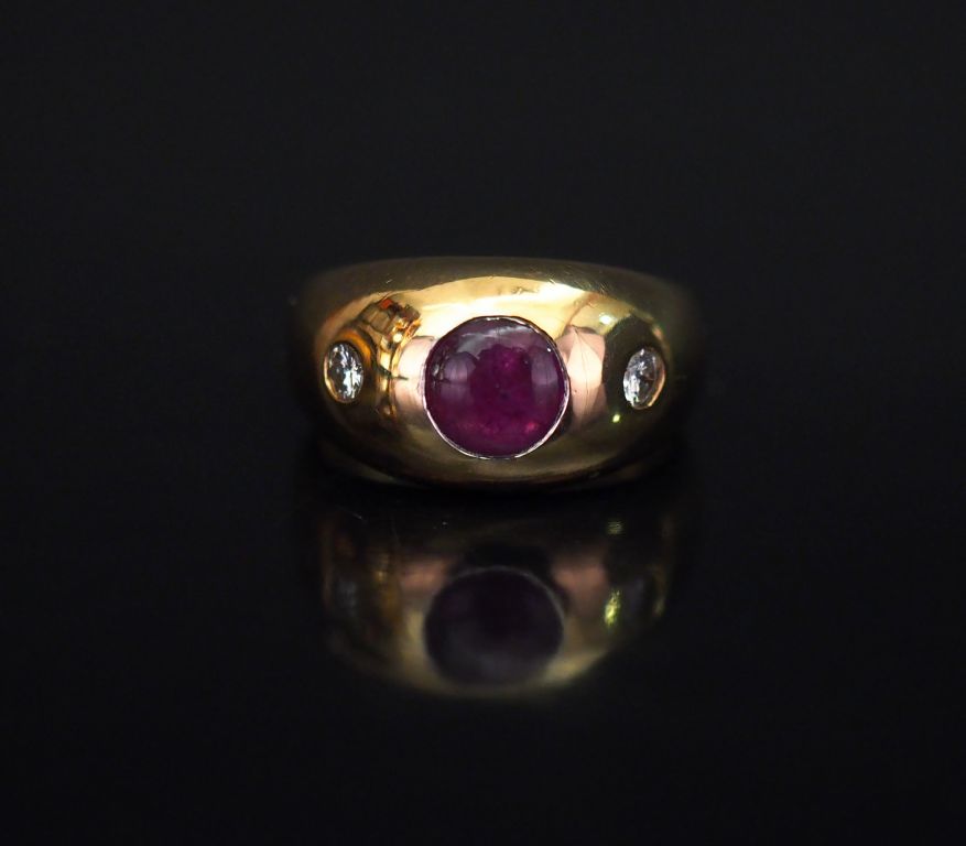 Bague jonc de forme légèrement bombée en or jaune, sertie en son centre d'une pierre rose en cabochon épaulée de deux petits diamants. TDD. 51 Poids tel. 11,25 g