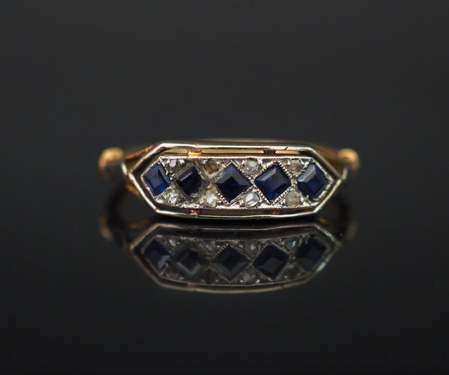 Bague jonc de style Art déco en or jaune, sertie de saphirs calibrés et petits éclats de diamant. TDD. 551 Poids tel. 2,01 g (petits accidents)