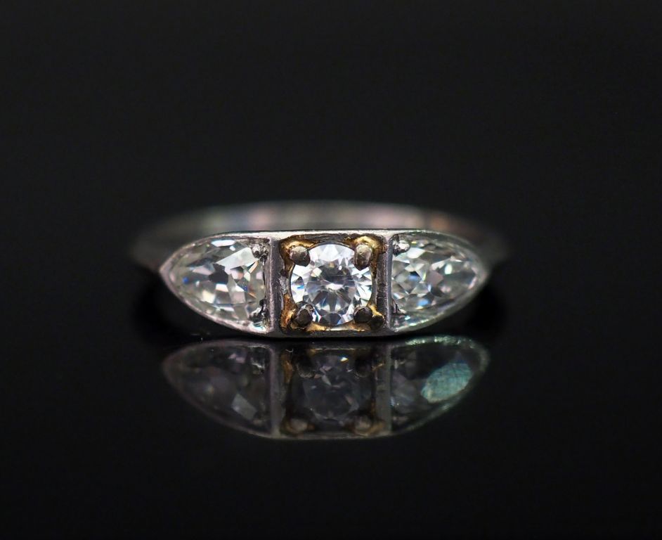 Bague jonc en or blanc, sertie de deux diamants taille poire entourant une pierre à l'imitation du diamant. TDD. 54 Poids tel. 3 g (monture accidentée)