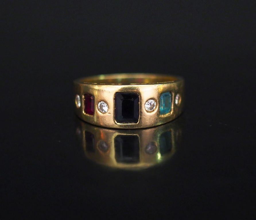 Bague jonc en or jaune 750, sertie de diamants et pierres de couleur en chute alternés. TDD. 53 Poids tel. 4,63 g (une pierre légèrement accidentée)