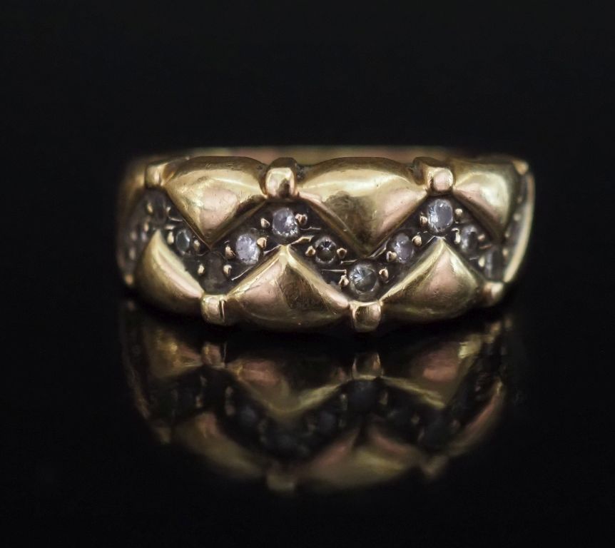 Bague jonc en or jaune 750, sertie d'une ligne de quinze petits diamants formant un zig-zag. TDD. 58 Poids tel. 5,43 g