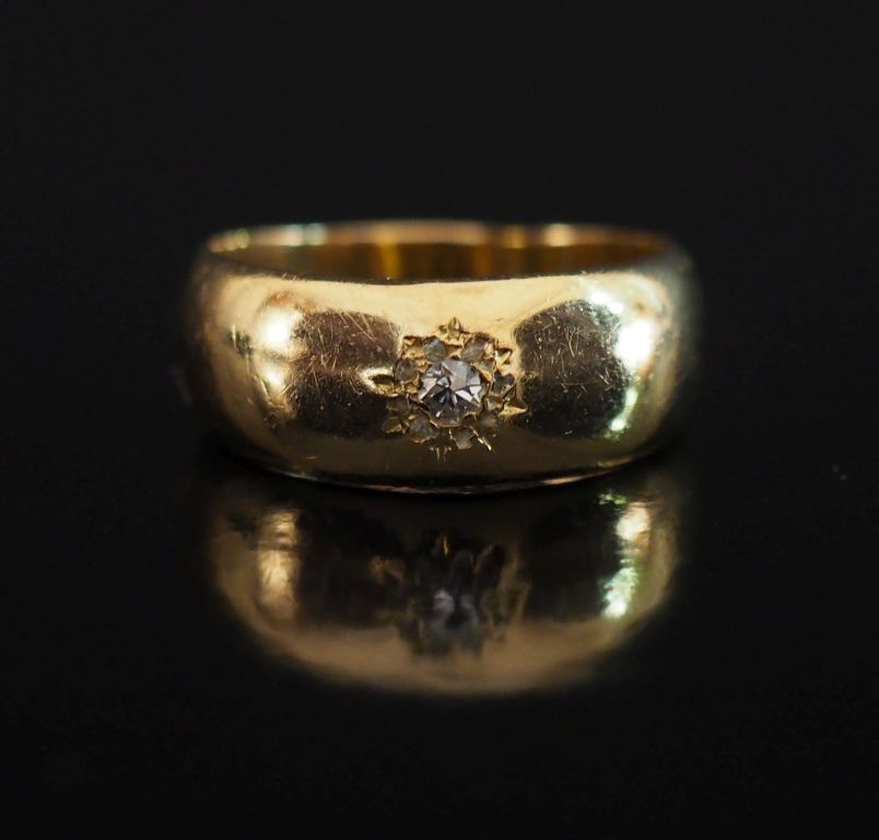 Bague jonc en or jaune 750, sertie en son centre d'un diamant taille ancienne entouré d'une couronne de petits éclats de diamant. TDD. 59 Poids tel. 8,70 g (petits manques)