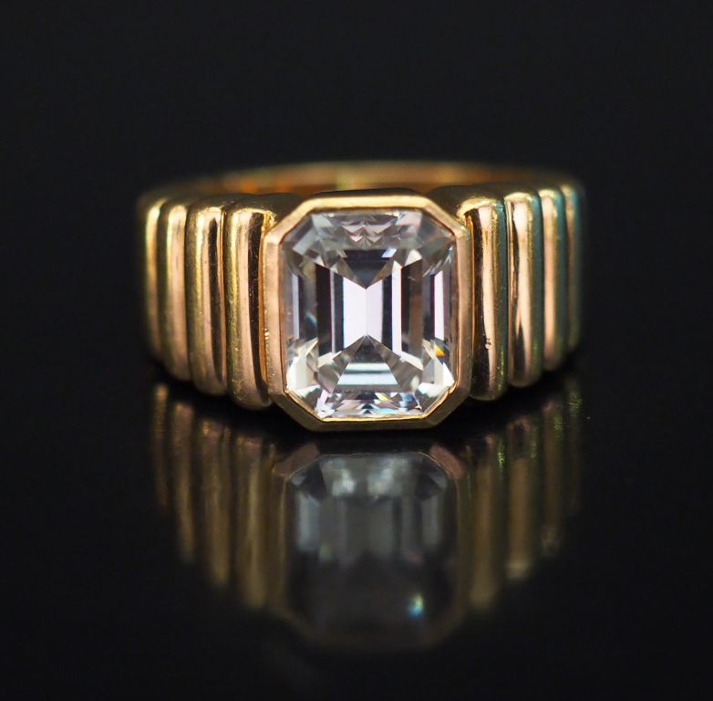 Bague jonc en or jaune, à décor de godrons en chute et sertie en son centre d'une pierre à l'imitation du diamant. TDD. 53 Poids tel.12,54 g