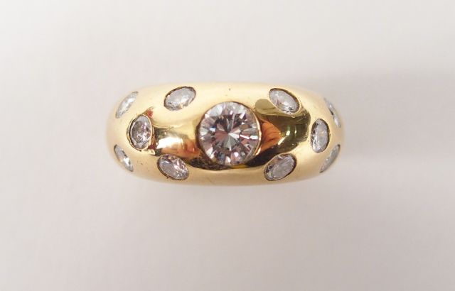 Bague jonc en or jaune, sertie en son centre d'un brillant de 0,45ct environ et rehaussée de 10 brillants de 0,06ct environ. TDD 50 Poids tel: 11,8gr