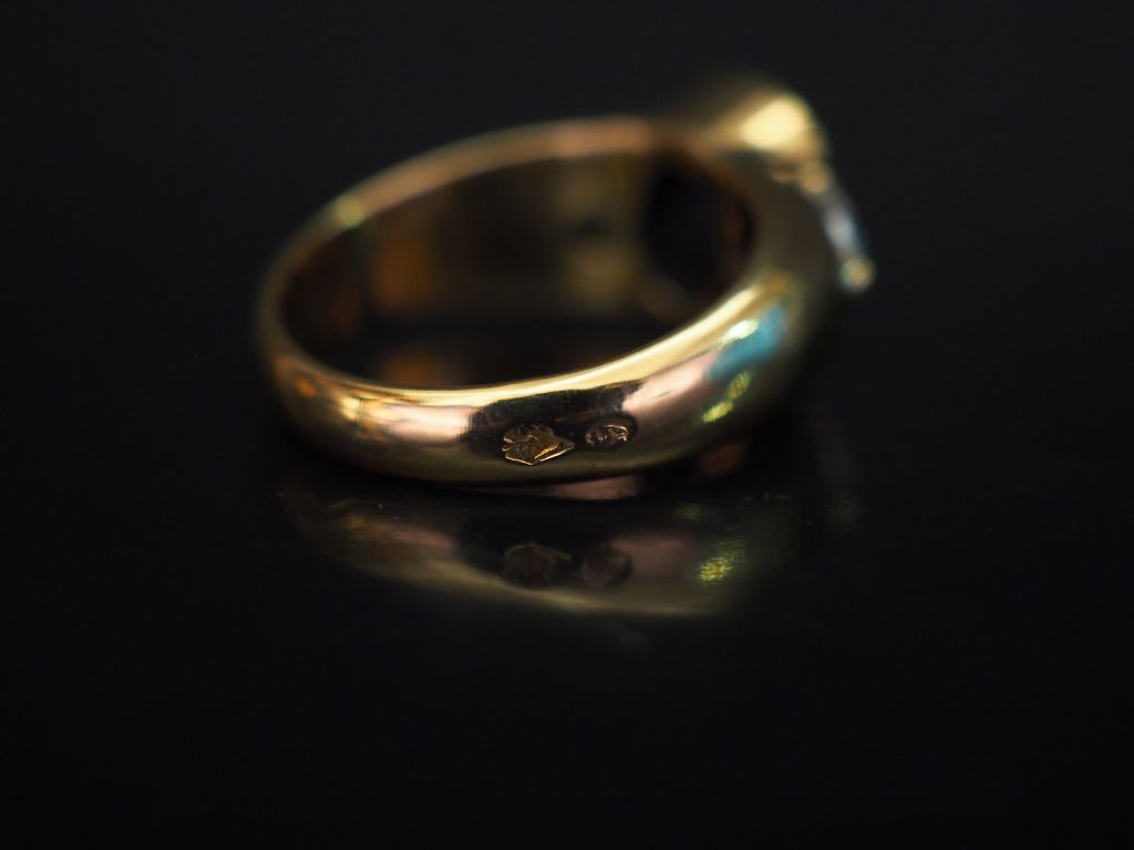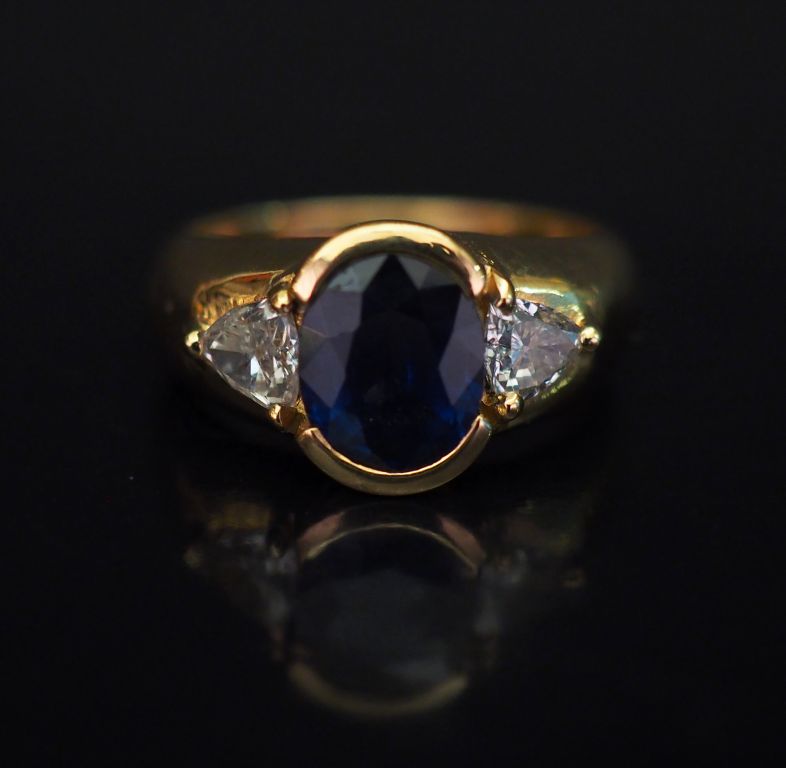 Bague jonc en or jaune, sertie en son centre d'un saphir épaulé de deux diamants de forme triangulaire. TDD. 53 Poids tel. 9,24 g