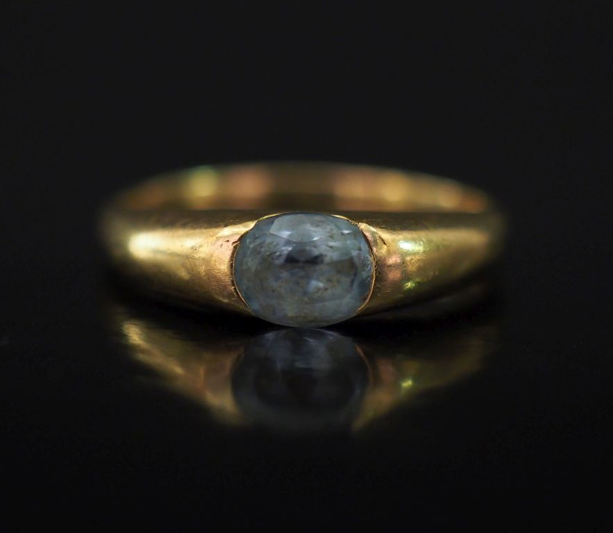 Bague jonc en or jaune, sertie en son centre d'une pierre bleu ciel. TDD. 58 Poids tel. 3,26 g (petit accident)