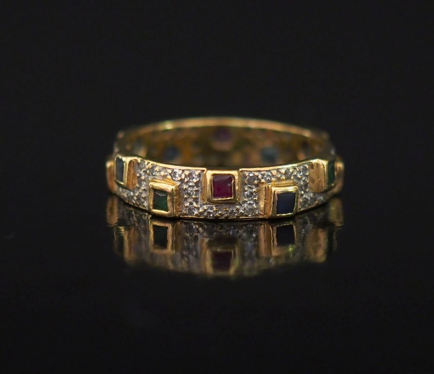 Bague jonc en or jaune, sertie sur tout le pourtour d'un pavage de petits diamants et ponctuée de pierres de couleur. TDD. 54 Poids tel. 2,90 g