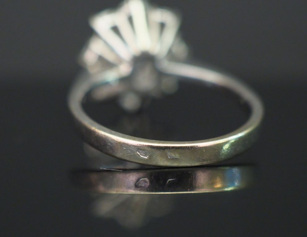 Bague marguerite en or blanc, sertie en son centre d’un saphir entouré de huit diamants. TDD. 53 Poids tel. 3,55 g