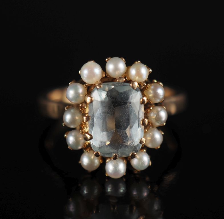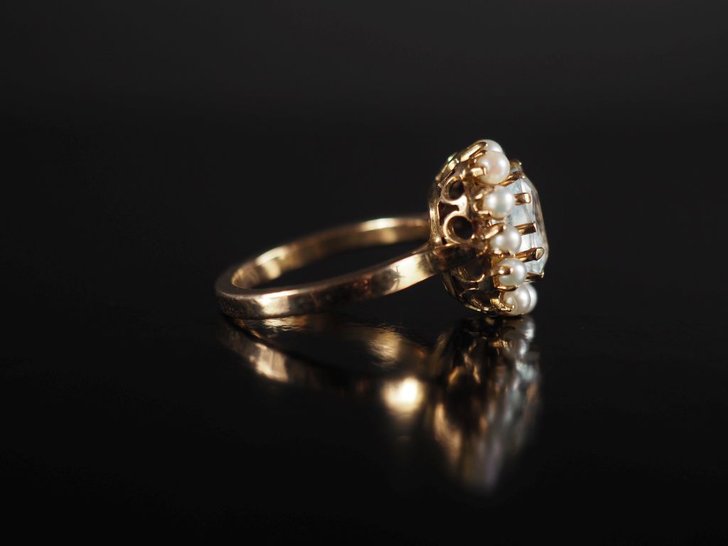 Bague marguerite en or jaune 750, sertie en son centre d'une pierre bleu ciel entourée d'une couronne de douze petites perles blanches. TDD. 52 Poids tel. 5,16 g