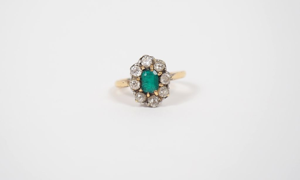 Bague marguerite en or jaune, ornée d’une émeraude entourée de huit diamants. TDD. 50 Poids tel. 3,58 g