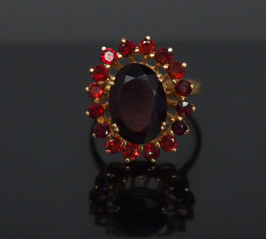 Bague marguerite en or jaune, sertie d’un grenat central entouré de seize petits grenats. TDD. 54 1/2 Poids tel. 5,56 g