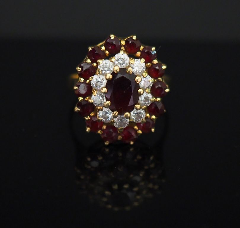 Bague marguerite en or jaune, sertie en son centre d’un grenat entouré d’une couronne de pierres à l’imitation du diamant et d’une couronne de petits grenats. TDD. 55 Poids tel. 6 g