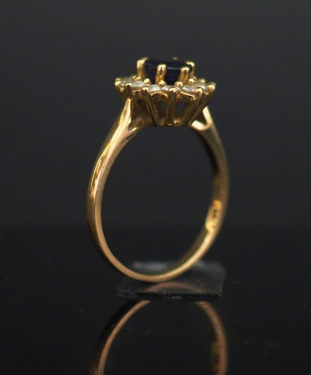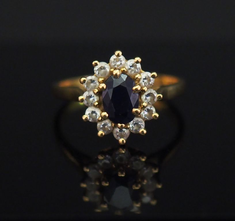Bague marguerite en or jaune, sertie en son centre d’une pierre bleue entourée de pierre à l’imitation du diamant. TDD. 56 Poids tel. 4,10 g