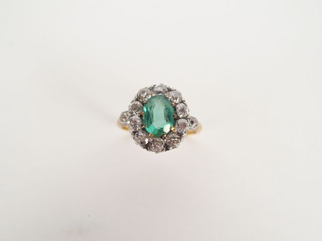 Bague marguerite monture or jaune, ornée d'une émeraude de 0,90cts environ entourage de 10 diamants taille ancienne de 0,08cts environ. TDD 50 Poids tel: 3,9gr