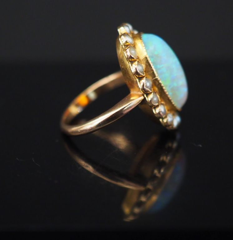 Bague marguerite Napoléon III en or jaune, sertie en son centre d'une opale entourée de perles. TDD. 48 Poids tel. 5,37 g (cheveux à l'opale)