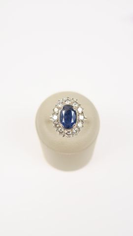 Bague marguerite, saphir entourée de 12 brillants. 6 g