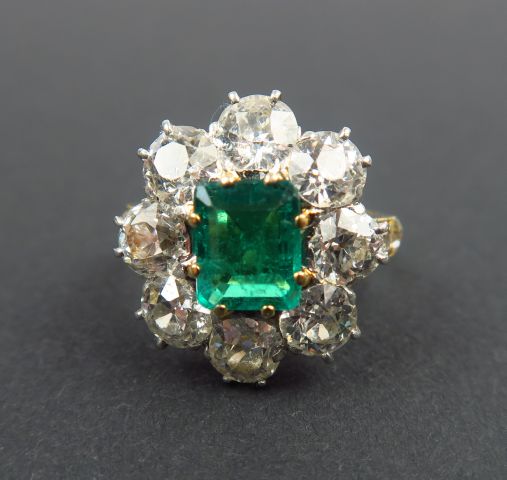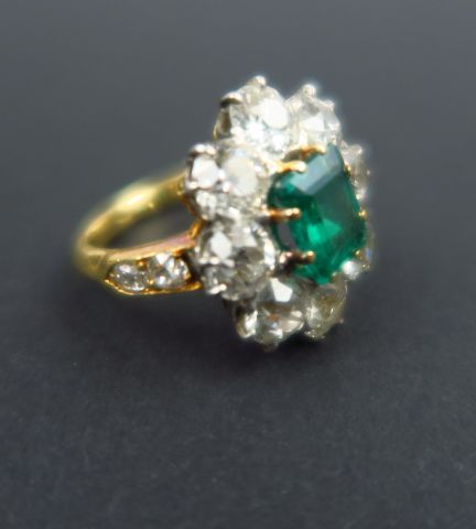 Bague marguerite sertie d'une émeraude et de huit diamants taille ancienne de 0,40 carats environ. Poids tel : 6,71 g