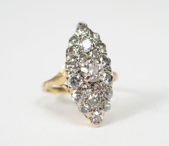 Bague marquise en or jaune, ornée en son centre d'un diamant taille ancienne de 0,30ct environ et pavage de diamants taille ancienne. TDD 49 Poids tel: 4,2gr